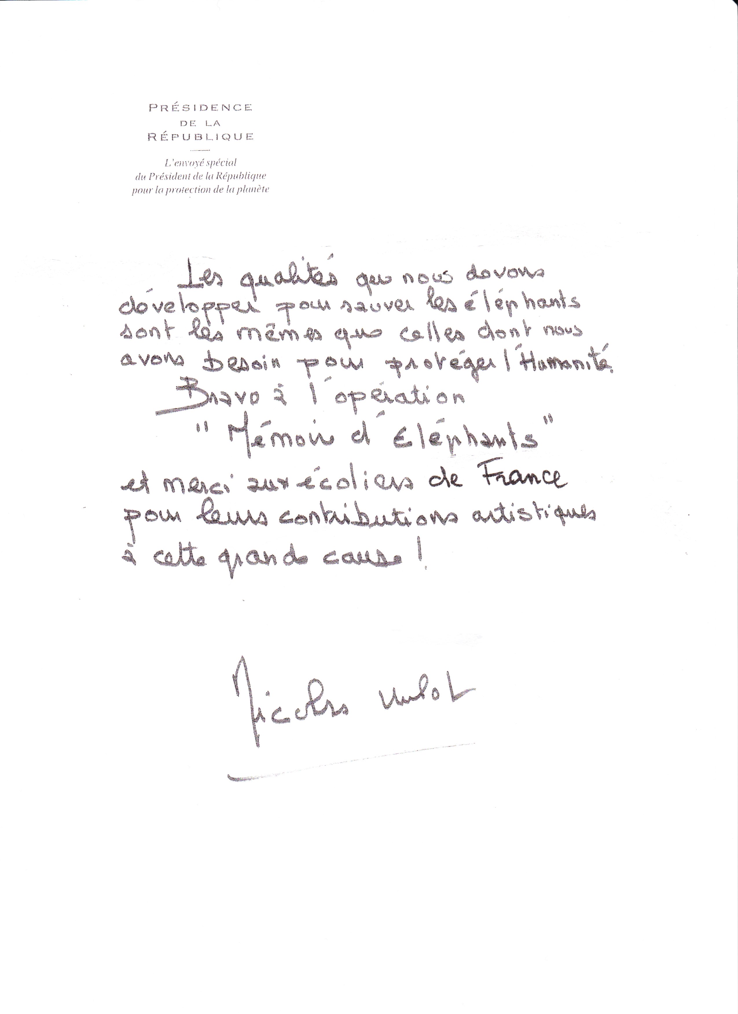 Congratulations on the project ” Elephants ‘ Memory ” and thanks to French Schoolchildren for their artistic contributions to this great enterprise ”